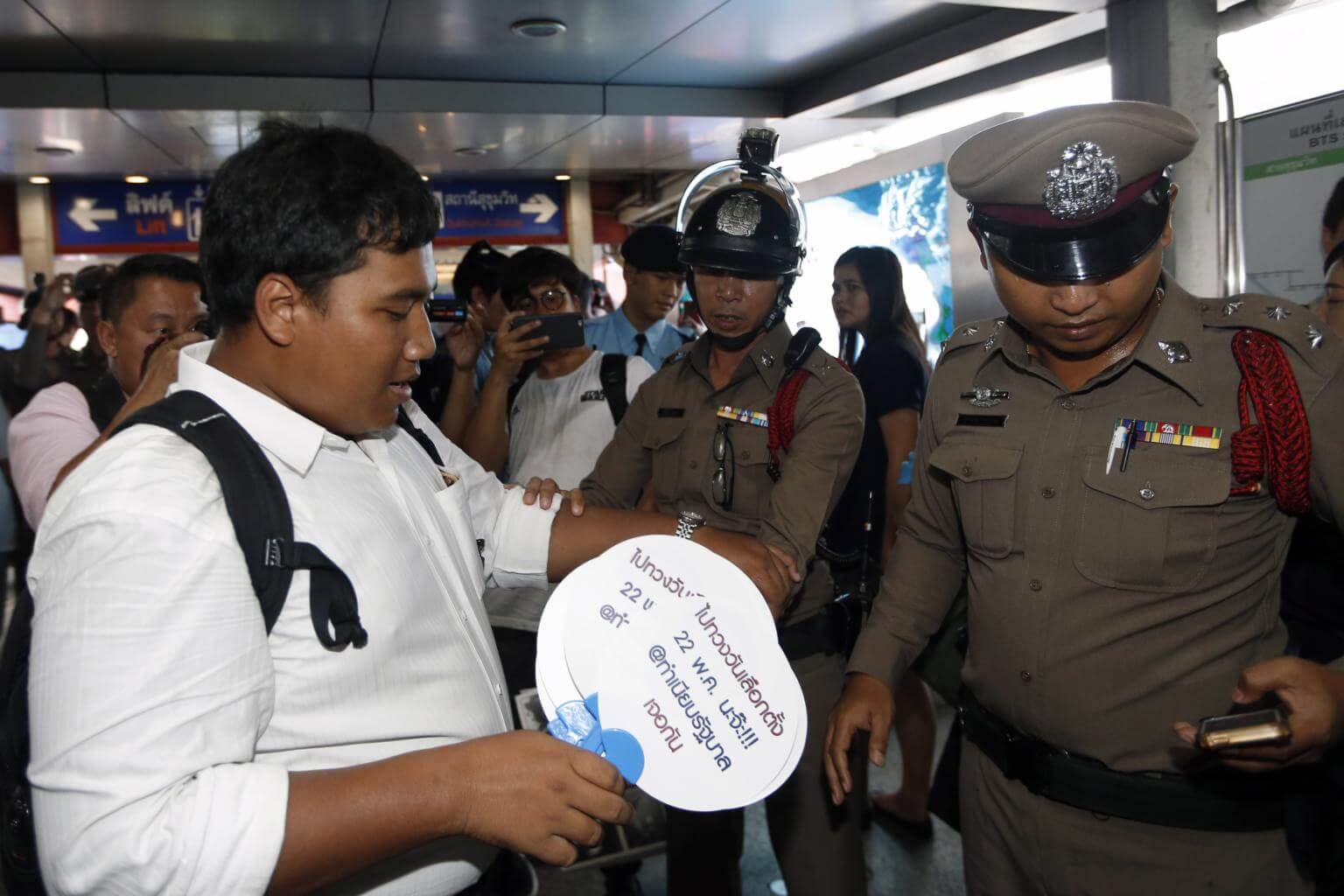 Police officers stopping a pro-democracy activist from handing out fans with caricatures of Thai Prime Minister Prayut Chan-o-cha during a rally calling for a general election outside a shopping mall in Bangkok, Thailand, on May 18 2018.