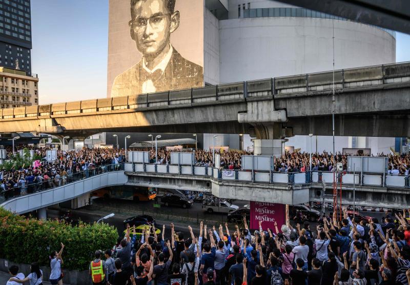A photo taken on Dec 14, 2019 shows Thai Future Forward Party supporters standing on a skywalk bridge in front of a mural featuring the late Thai King Bhumibol Adulyadej during an unauthorised flash mob rally in Bangkok.