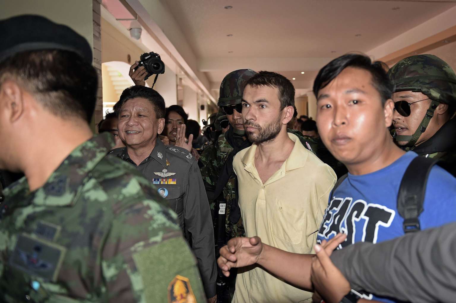A foreign suspect in the Aug 17 Erawan shrine bombing, identified by the ruling junta as Adem Karadag (centre), is escorted by soldiers.