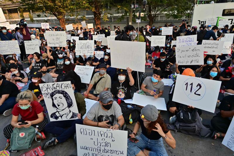 Pro-democracy protesters hold up signs outside the Thai Parliament as they take part in an anti-government rally in Bangkok on Feb 20, 2021.