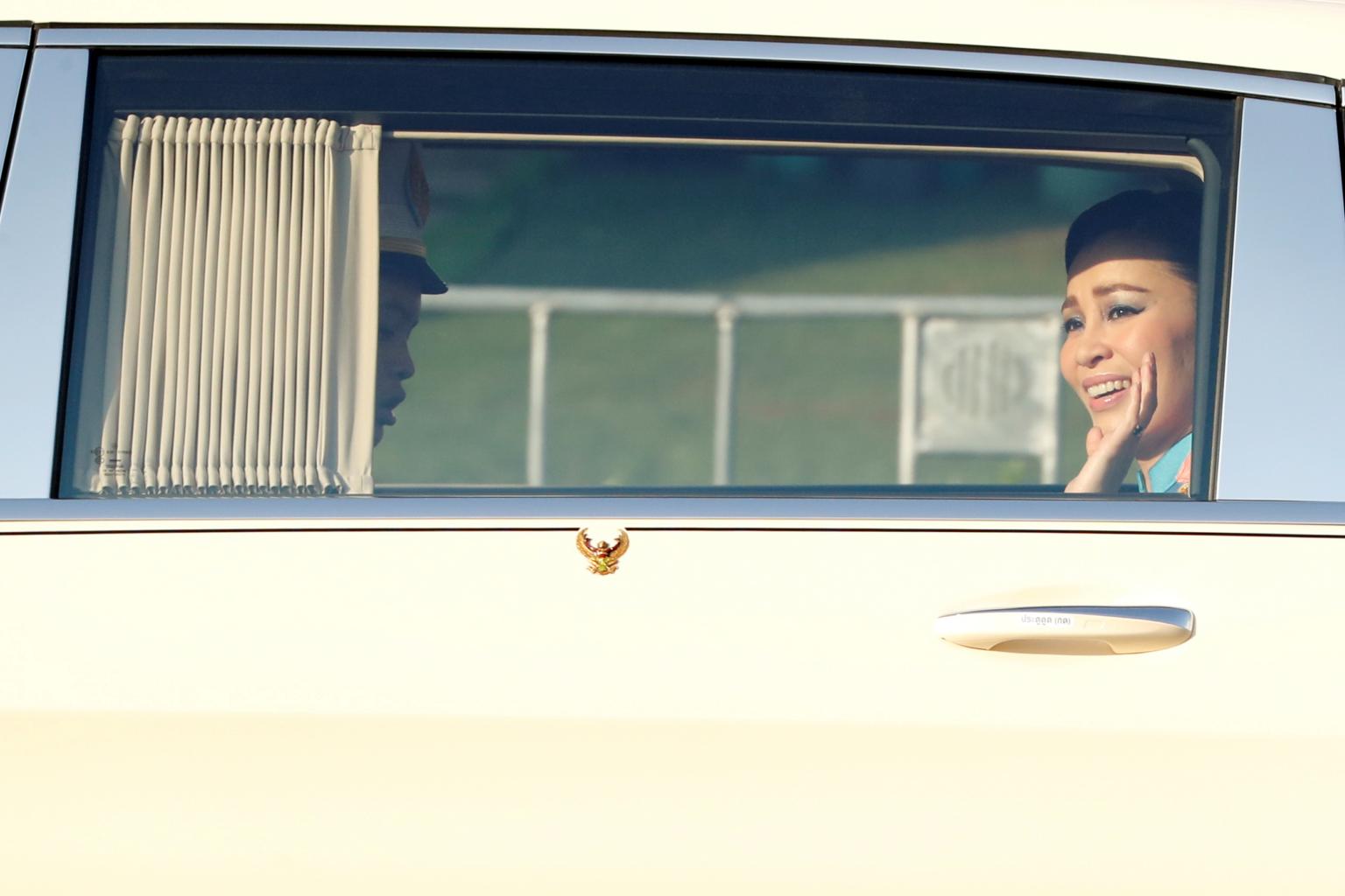 Thailand's Queen Suthida is pictured as the motorcade drives towards the Grand Palace in Bangkok, on Oct 14, 2020.