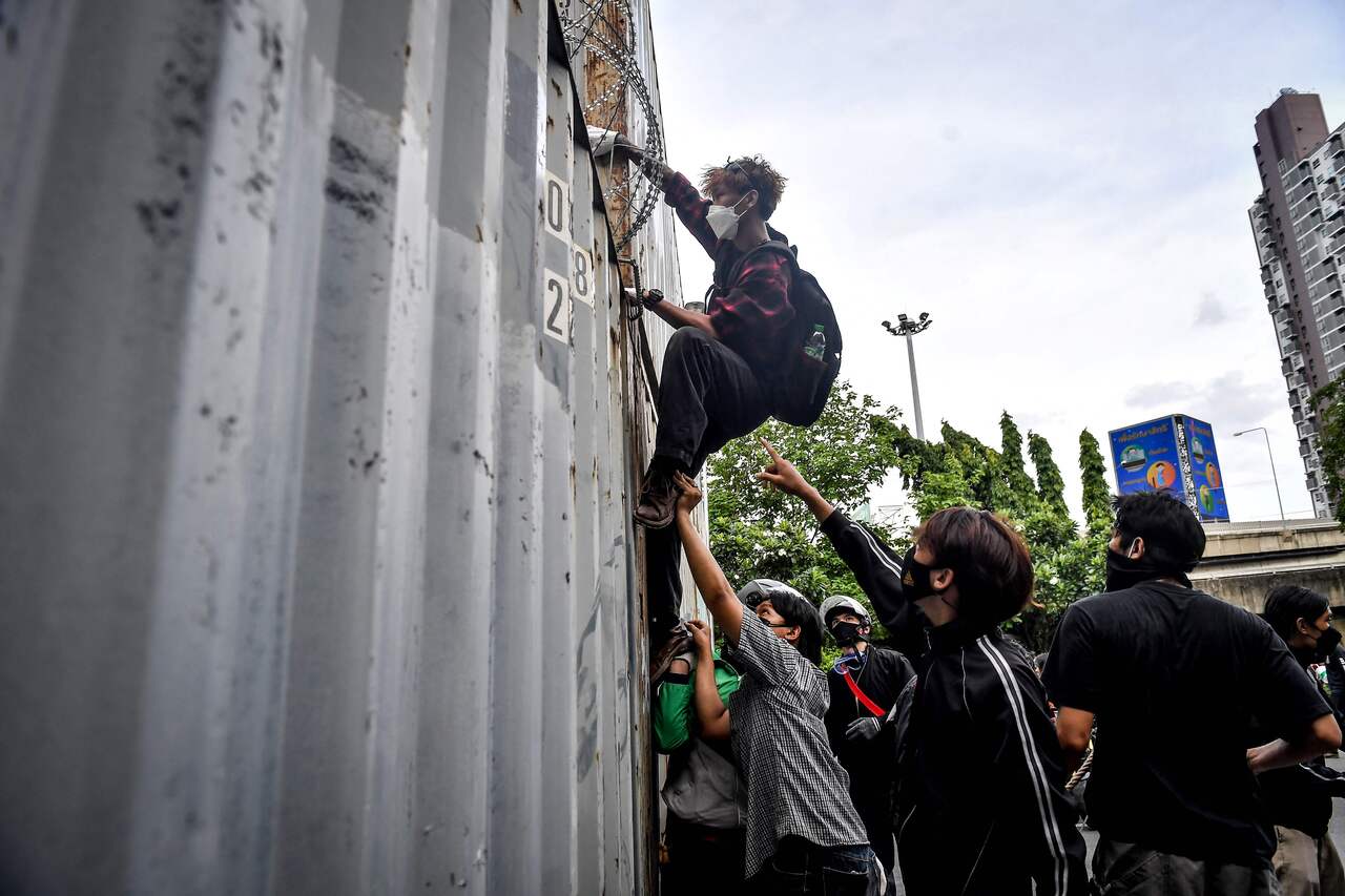 A protester climbs a wall of shipping containers during a demonstration calling for the resignation of Thai PM Prayut Chan-o-cha, in Bangkok, on Aug 13, 2021.