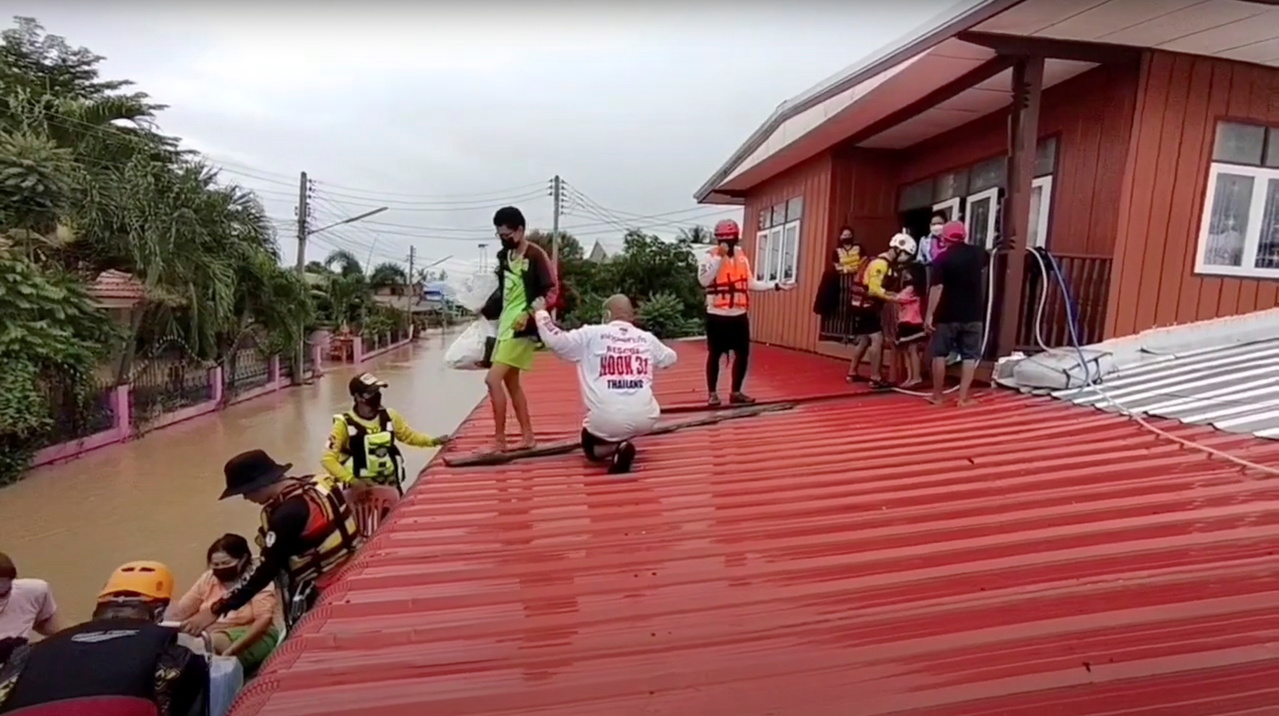 Rescuers wearing orange helmets and life jackets travelled by boats through submerged streets in the northeastern province of Chaiyaphum to reach people stuck on the roofs of their homes.