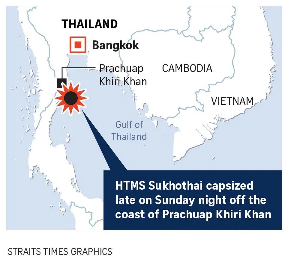 There were 105 sailors on board the HTMS Sukhothai, a corvette which went down 37km off the shore of the Prachuap Khiri Khan province, according to a navy tweet and government statement. Seventy-five people were rescued on Monday, according to the navy.