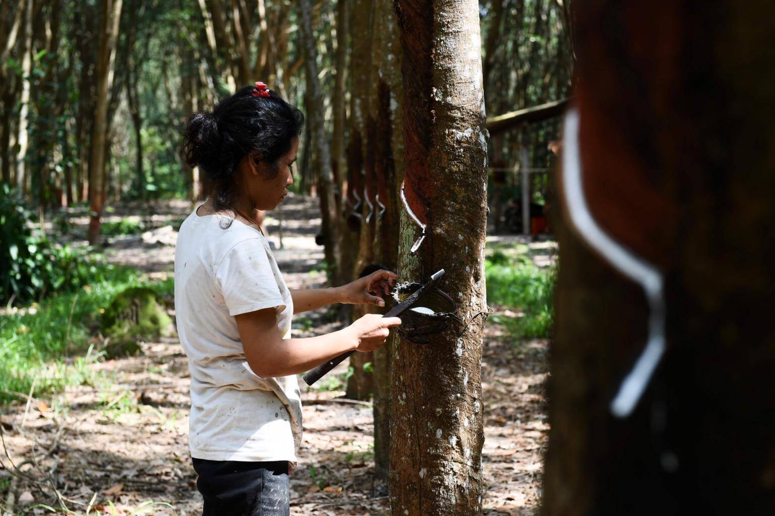 A woman taps a tree to harvest latex at a rubber plantation in Rayong Province, on Oct 17, 2018.