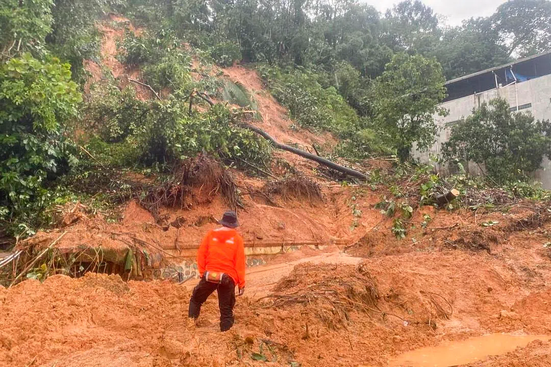A rescuer inspecting the site of a landslide in North Sumatra province, Indonesia on Nov 25.