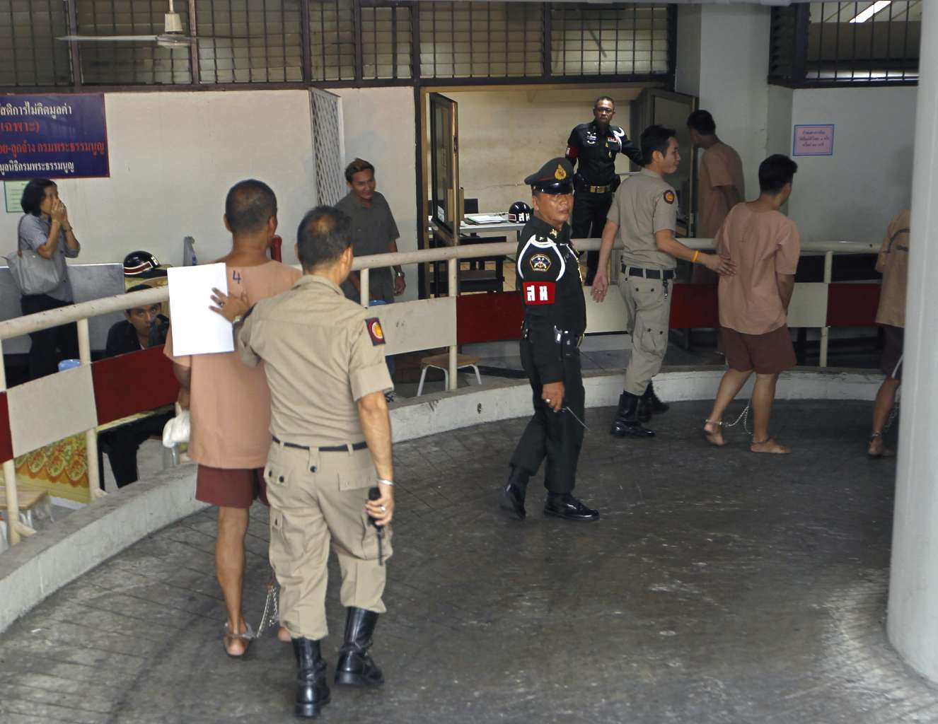 Prison officials escort some of eight Thai citizens detained after allegedly posting messages criticizing Thailand's Prime Minister on Facebook on May 10, 2016.