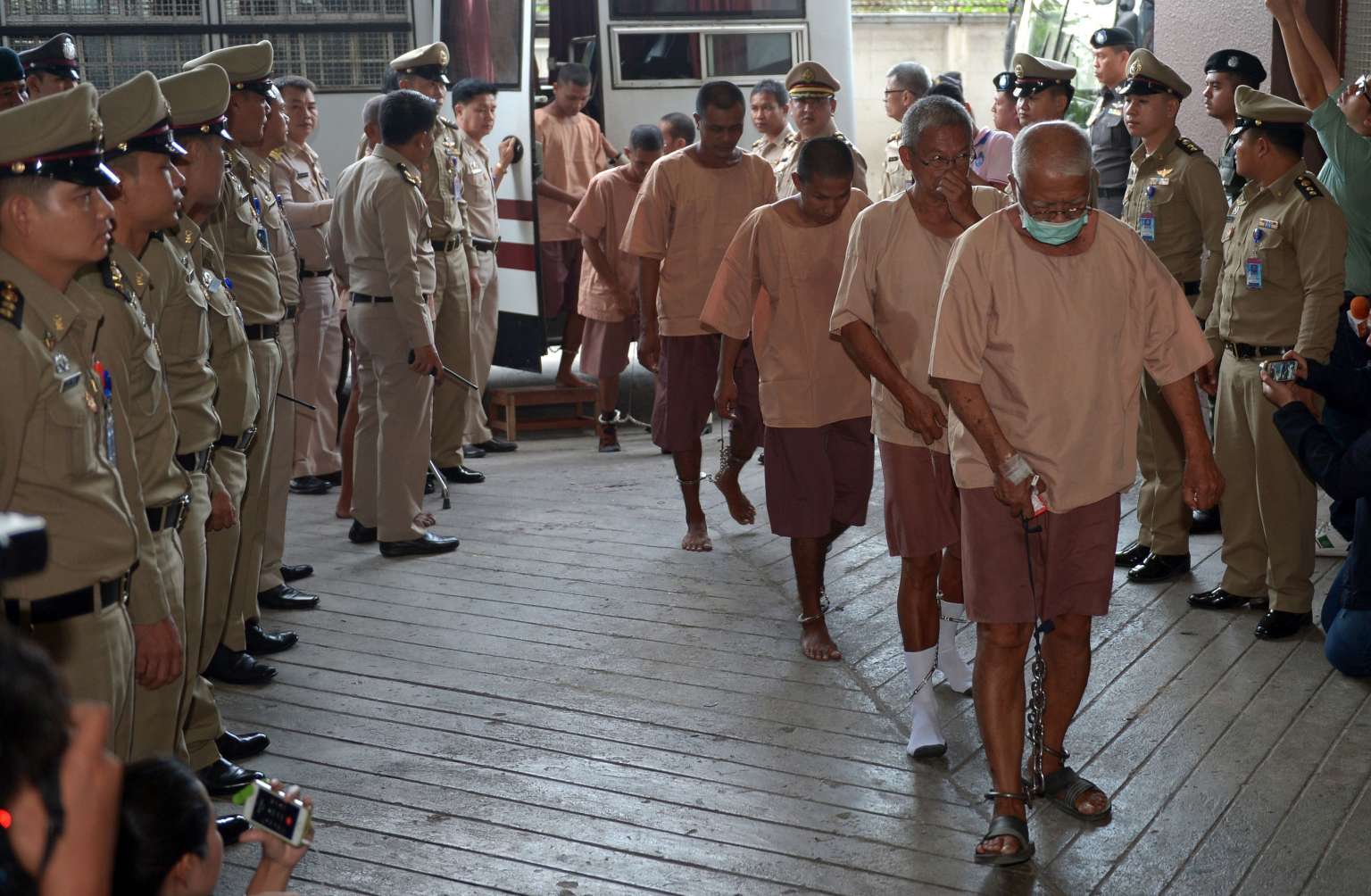 Suspects in a human trafficking case arriving at a criminal court in Bangkok on Nov 10, 2015.