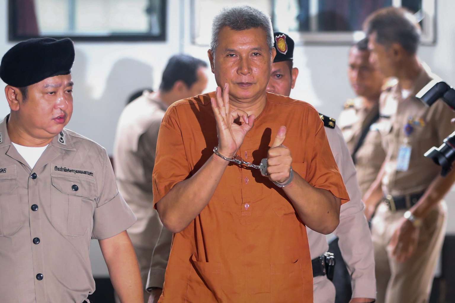 Thanat Thanawatcharanon, known by his stage name of Tom Dundee, gave waiting media the thumbs-up as he arrived at court on Wednesday, wearing an orange prison uniform.