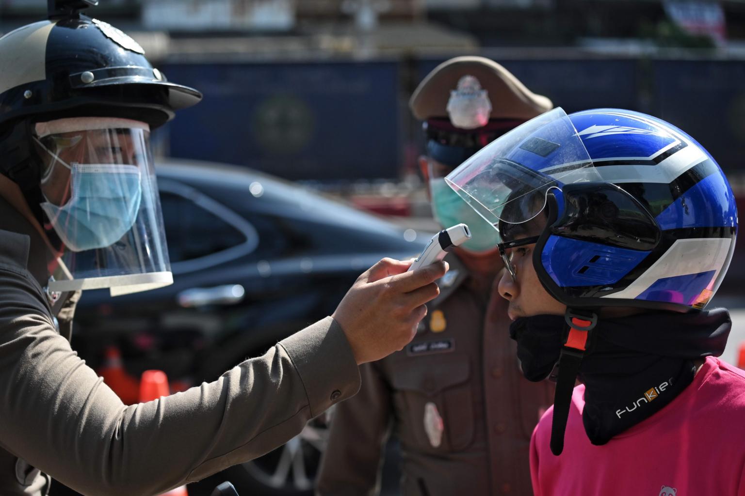 A member of the Royal Thai Police takes a food delivery rider's temperature at a checkpoint on the outskirts of Bangkok, on March 26, 2020.