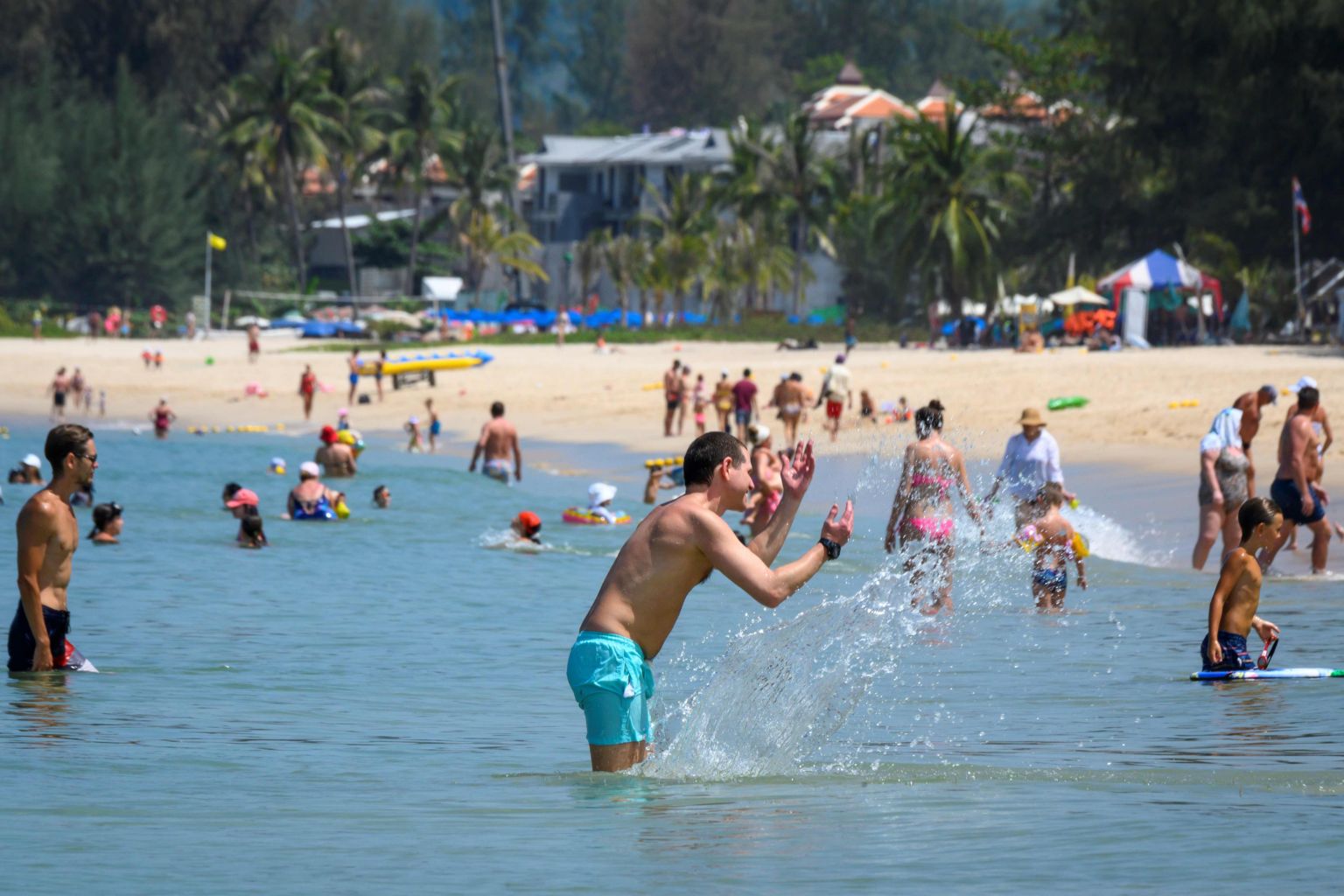 In a photo from March 20, 2020, international tourists, predominantly Russian nationals, enjoy the beach at a resort in Phuket.