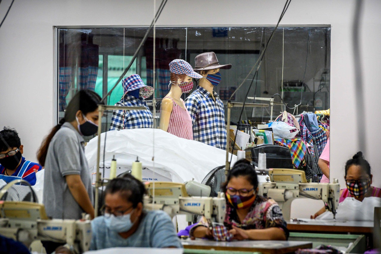 Employees sew personal protective equipment for use at the Center of Empowerment for the People with Disabilities in Bangkok on April 29, 2020.