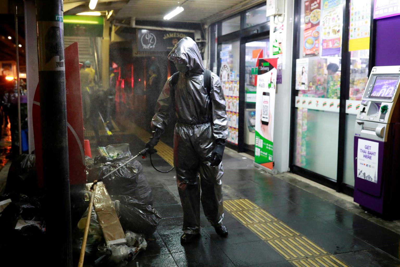 A Royal Thai Army soldier sprays sanitizer in Bangkok on March 21, 2020.