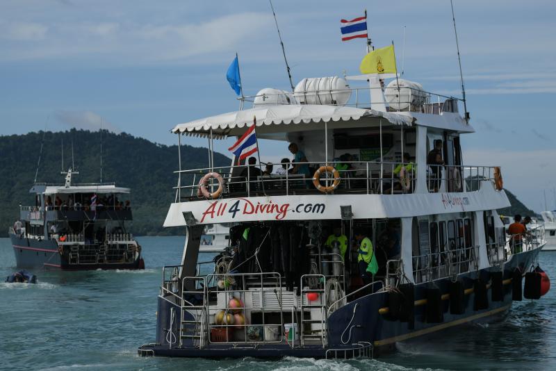 A boat carrying divers leaves Chalong pier on July 7, as rescue operations continue for missing tourists following a boat accident in Phuket, on July 5, 2018.