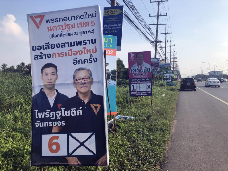 Election campaign posters of the Future Forward Party and the Chart Thai Pattana Party in Nakhon Pathom province.