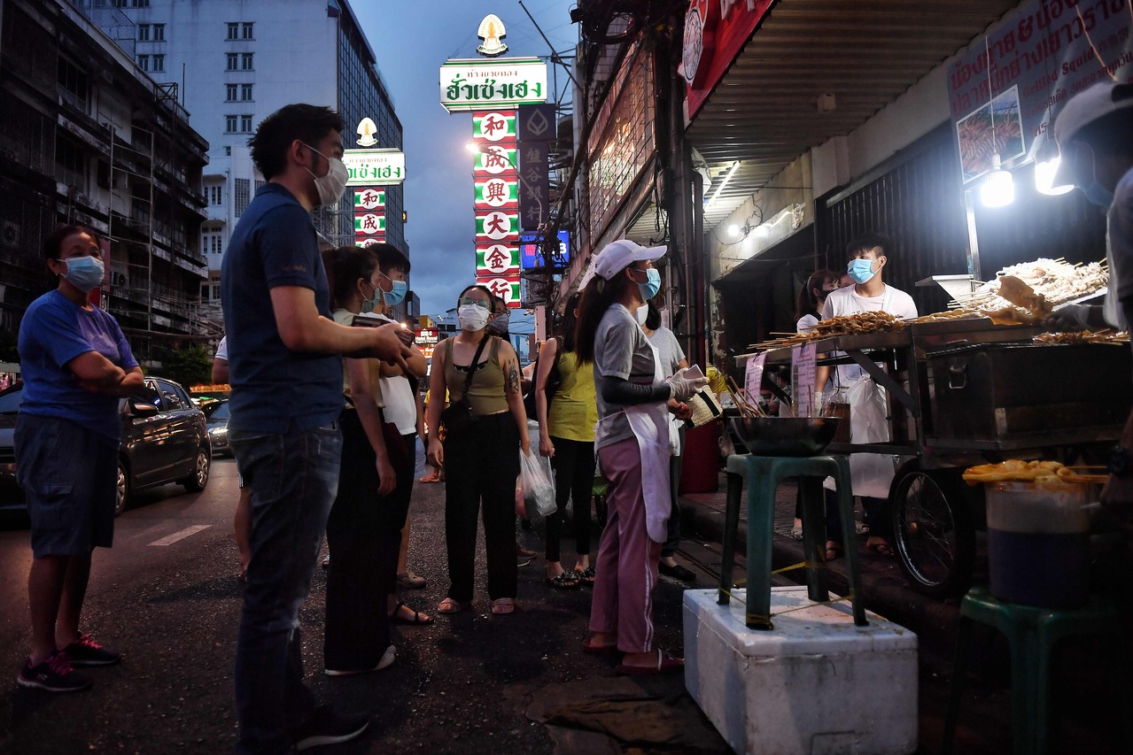People wait for orders as street food vendors serve takeaway in Chinatown, Bangkok on April 17, 2020.