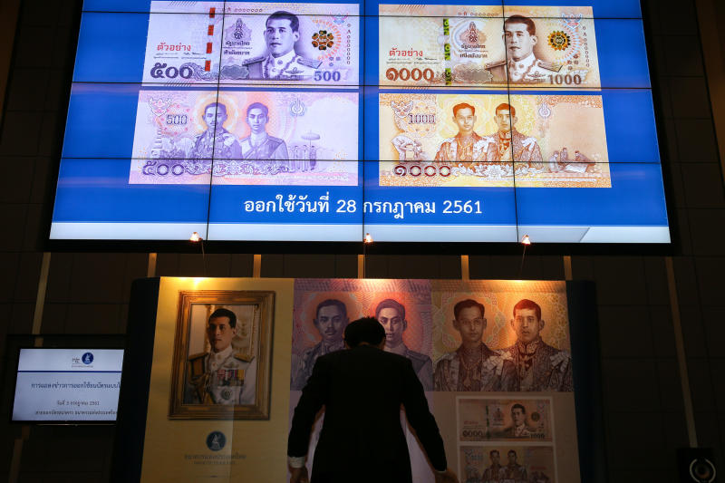 New baht banknotes featuring Thailand's King Maha Vajiralongkorn are unveiled during a news conference at Bank of Thailand headquarters in Bangkok, Thailand, July 3, 2018.