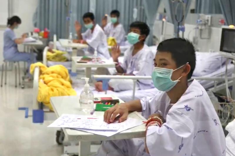 The rescued "Wild Boars" football team members recovering at a hospital in Chiang Rai province on July 13, 2018.