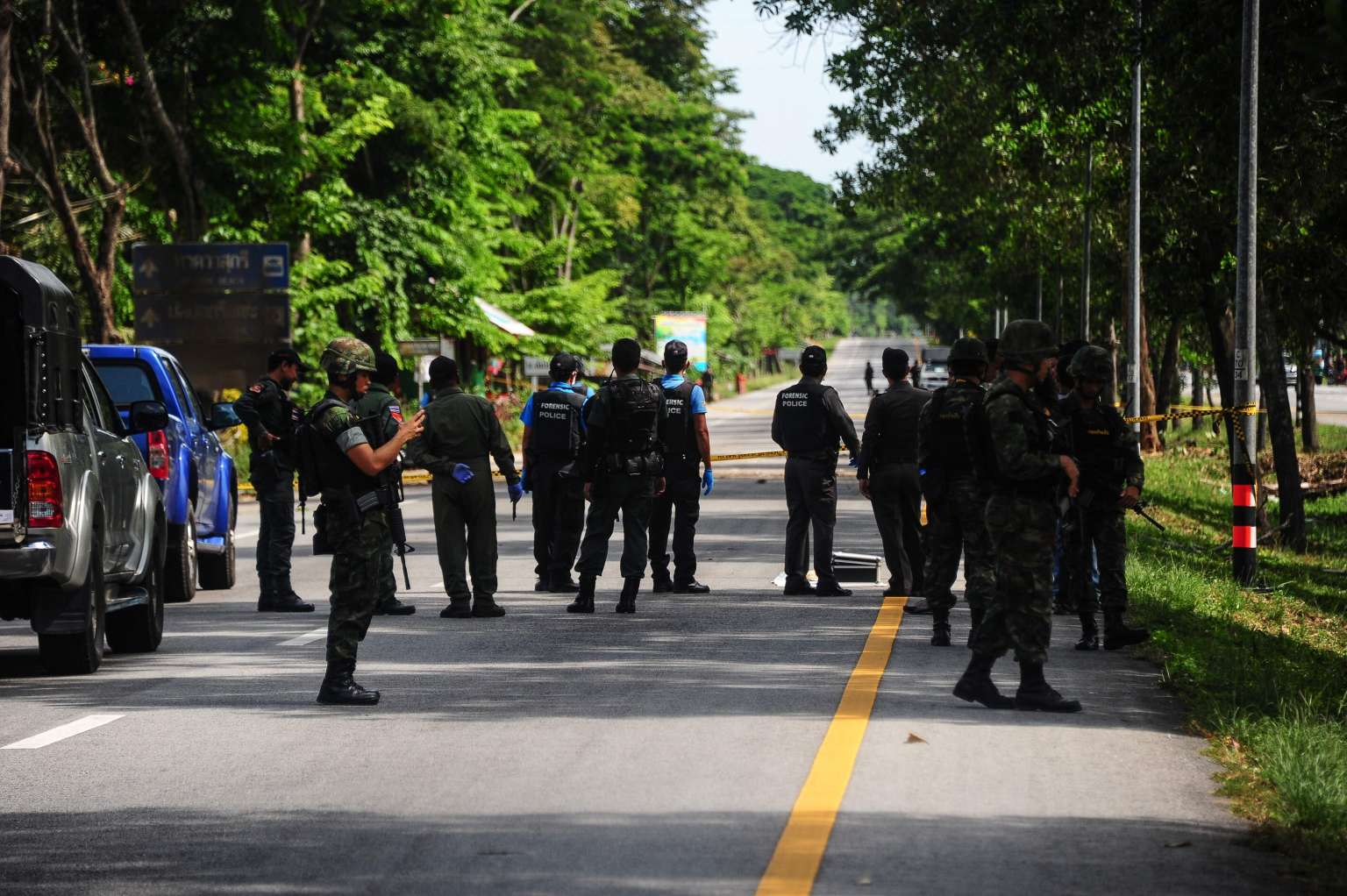 Thai soldiers watch as a forensic unit inspects the scene of an attack following two roadside bomb blasts at four separate locations in the Bacho district of Thailand's restive southern province of Narathiwat on August 15.