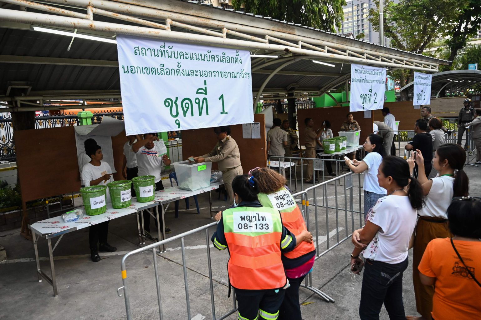 People watch as electoral officials count votes at a polling station in Bangkok on March 24, 2019, after polls closed in Thailand's general election.