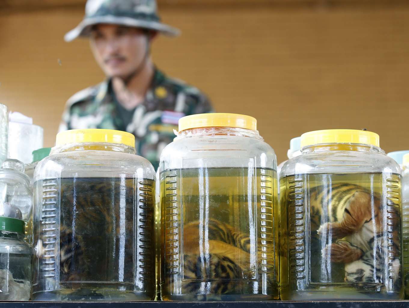Jars of dead tiger cubs were found during a raid at the Tiger Temple in Kanchanaburi Province, Thailand, on June 3, 2016.