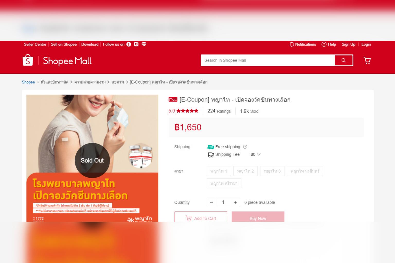 "It was sold out within minutes," a Shopee spokesman said on Friday (July 9), adding that the vaccine sale saw a spike in traffic on Phyathai Hospital's page, attracting 2.6 million visitors.