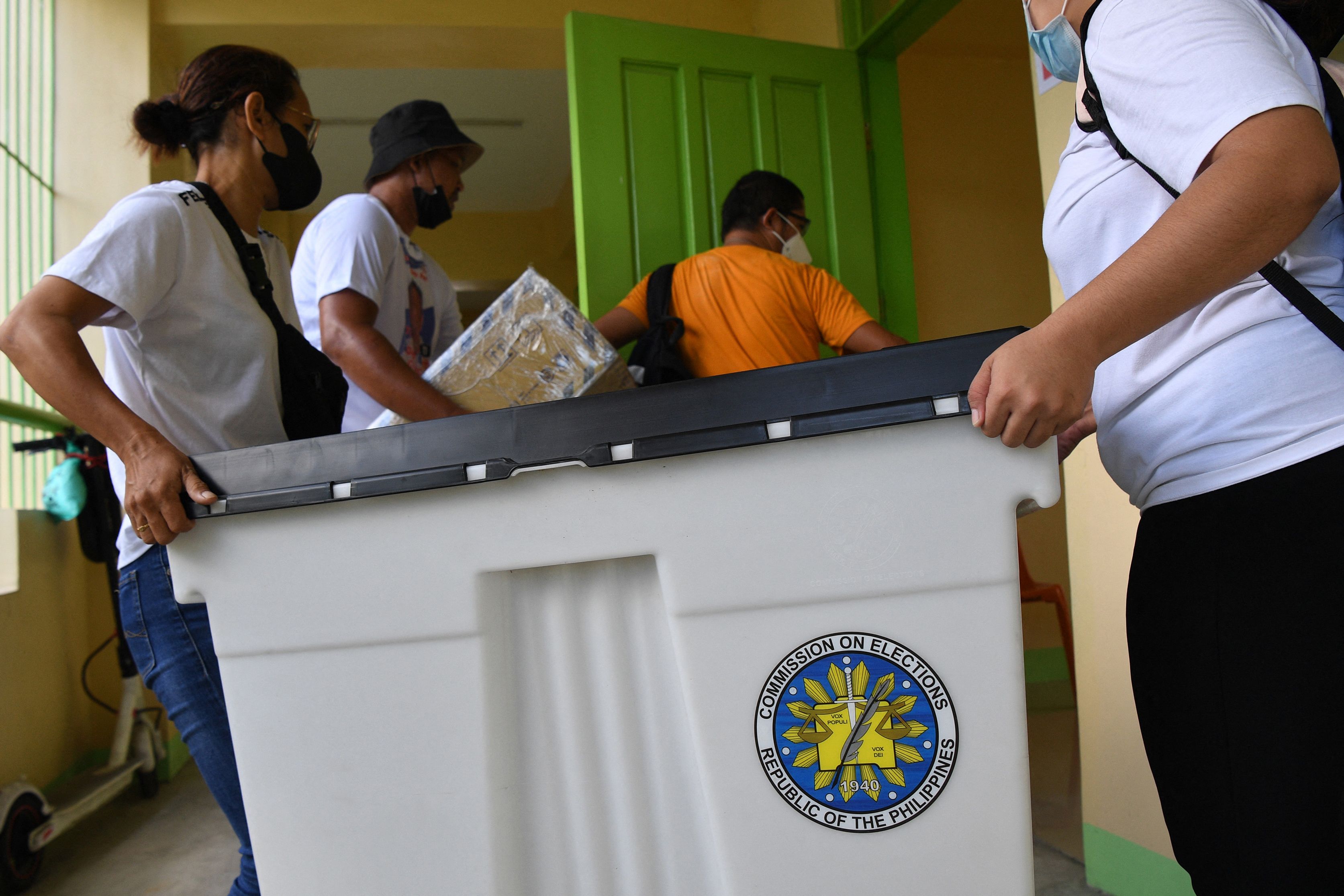 Poll workers carry a ballot box during preparations ahead of the presidential elections in Manila on May 4, 2022.