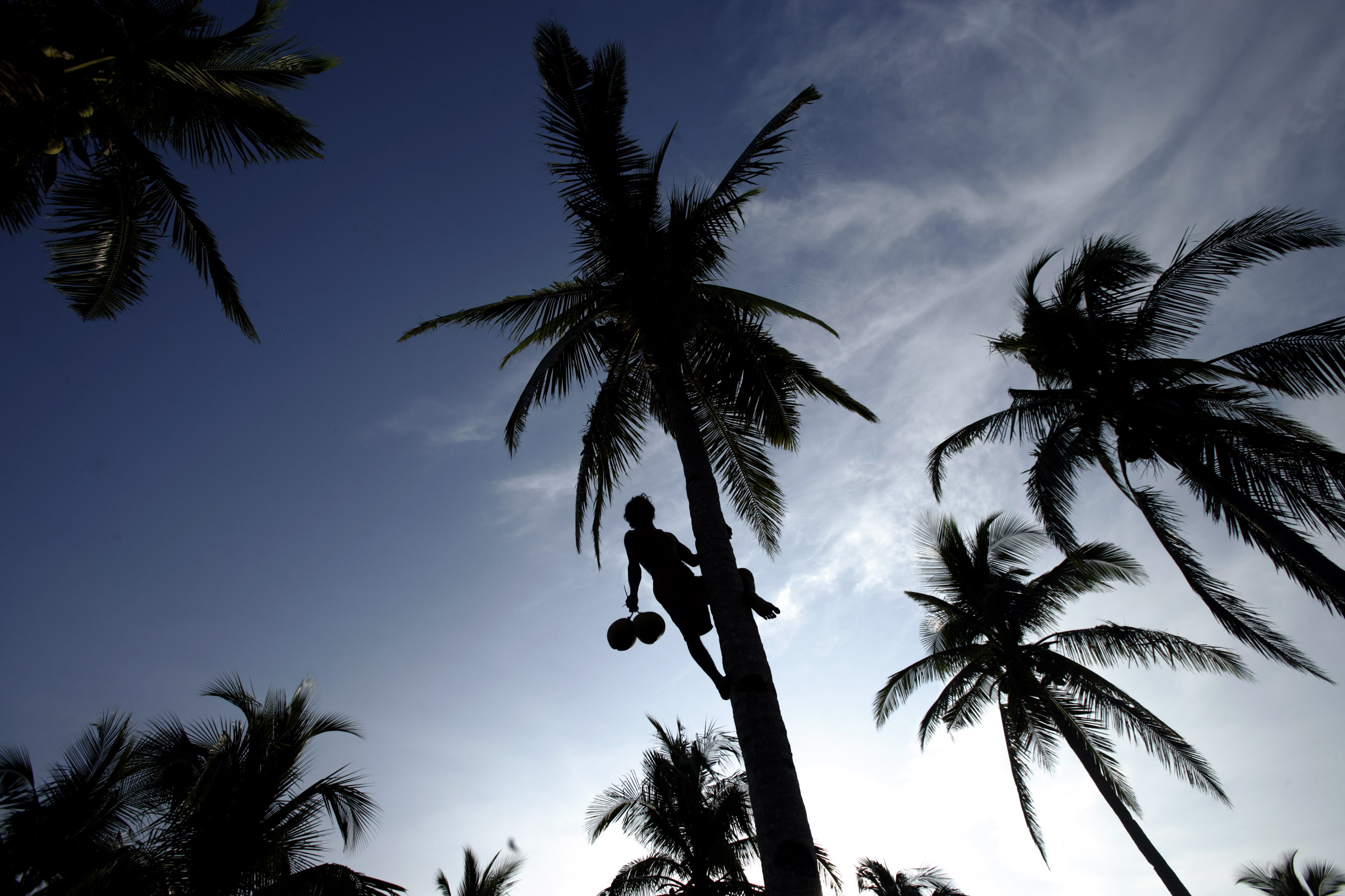 A worker collects coconuts from the top of a tree at a coconut plantation outside Legazpi city, Philippines, on May 20, 2007.