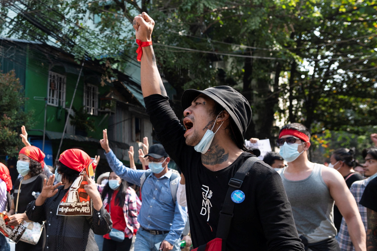 People shout slogans as they take part in a protest against the military coup and to demand the release of elected leader Aung San Suu Kyi, in Yangon on Feb 7, 2021.