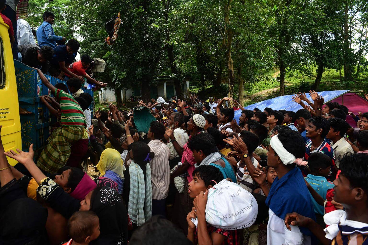 Rohingya refugees from Myanmar gather around a truck delivering food aid in Ukhia on Sept 14, 2017.