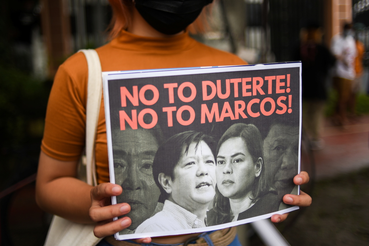 A demonstrator protests following the presidential bid announcement of Ferdinand Marcos Jr in Metro Manila on Oct 6, 2021.