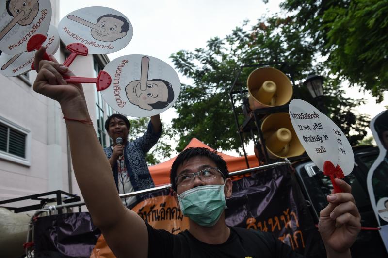 Demonstrators display cartoons portraying Thai Prime Minister Prayut Chan-o-cha as Pinocchio during a protest at Thammasat University in Bangkok on May 22, 2018, to mark the fourth year of junta rule.
