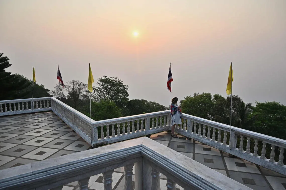 A visitor looking out at high levels of air pollution from the top of Doi Suthep temple in Chiang Mai on April 11, 2023.