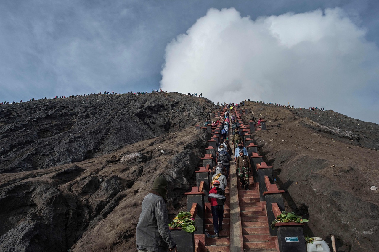 PROBOLINGGO, INDONESIA (AFP) - Thousands of worshippers trudged up an active Indonesian volcano Saturday (June 26) to cast livestock and other offerings down its smouldering crater in a centuries-old religious ceremony.
