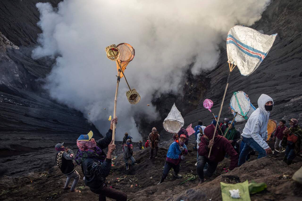 Standing on the crater's steep slopes, other villagers - who are not members of the Tengger tribe - try to catch the offerings using nets and sarongs before they disappear into the billowing smoke.