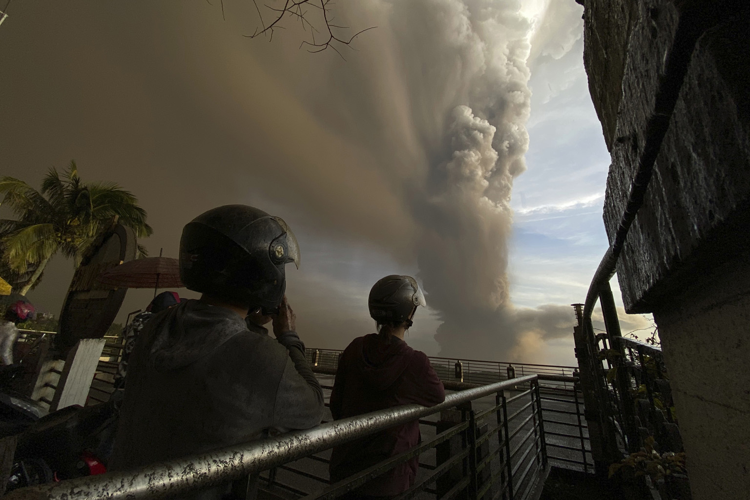 People watching plumes of smoke and ash rising from Taal Volcano, south of Manila, yesterday. The volcano spewed ash up to 15km into the air, prompting the evacuation of thousands of people, the cancellation of flights and warnings of a possible explosive eruption and volcanic tsunami.