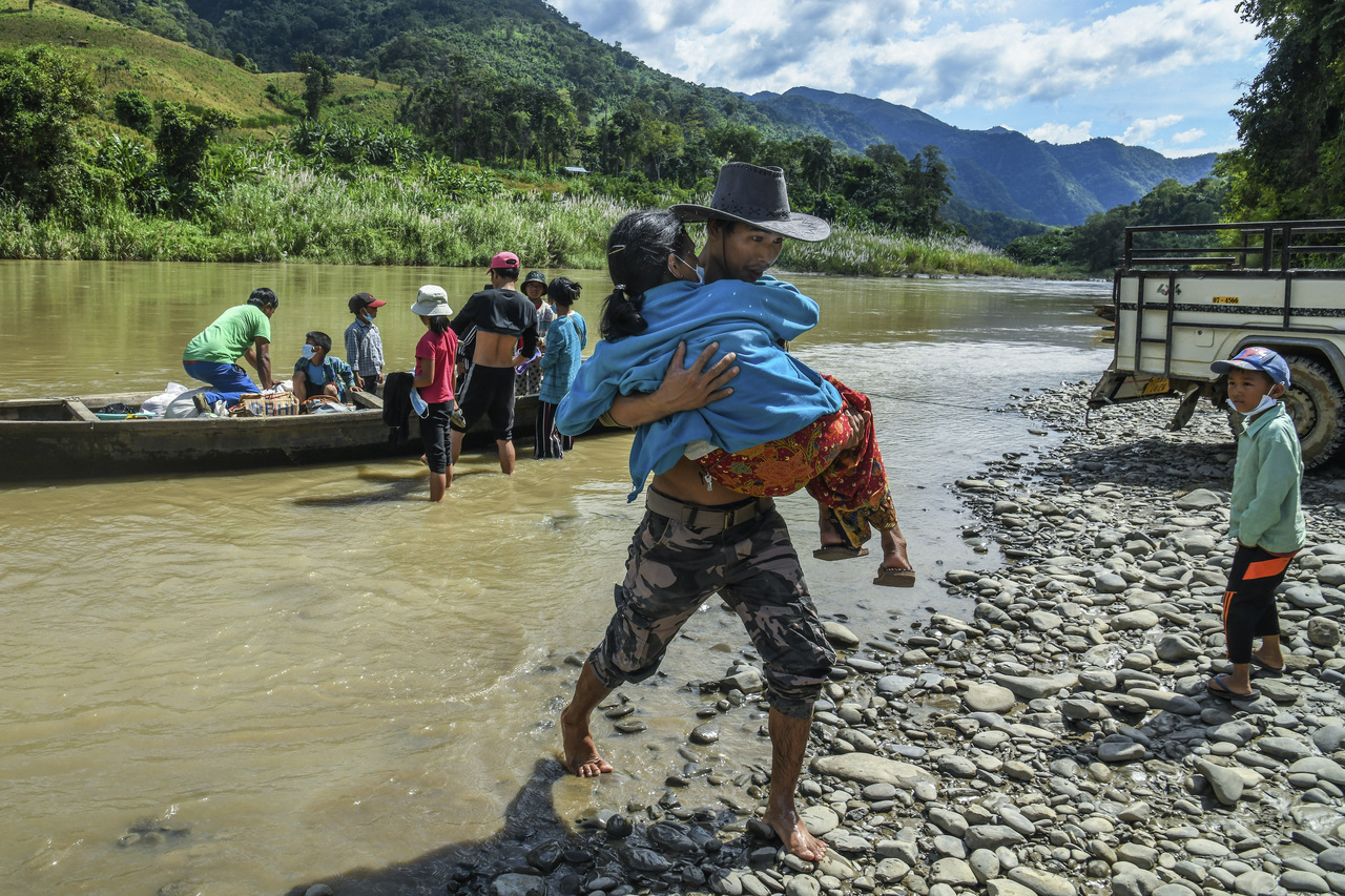 A refugee carries his grandmother to the shore of Mizoram, India, after crossing the Tiau River from Myanmar, on Oct 14, 2021.
