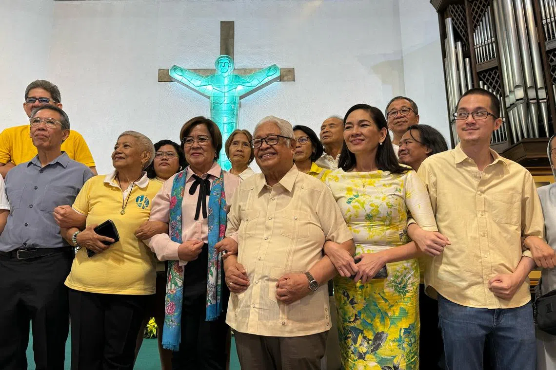 (From left) Philippine opposition leaders Chel Diokno, Teresita Deles, Leila de Lima, Edcel Lagman, Risa Hontiveros and Kiko Aquino Dee at a mass held in Manila on Feb 24, a day before the People Power anniversary.
