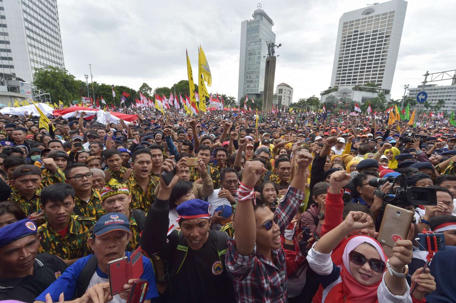 Indonesian people shout slogans as they attend a pro-government rally to call for unity in Jakarta on Dec 4, 2016.