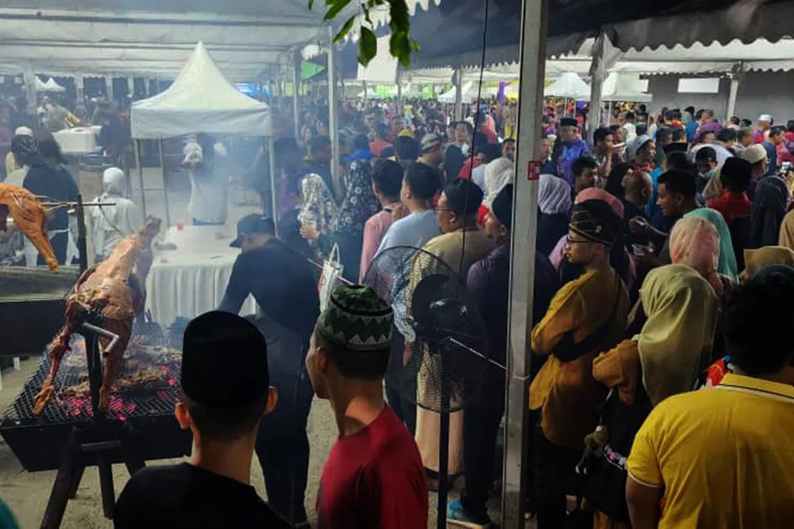 Police on duty at the open house, held at the Sultan Muhammad IV stadium, estimated that 15,000 people attended the event, with long queues at stalls offering drinks and food such as roast lamb, fish satay, fried bee hoon and fruit.
