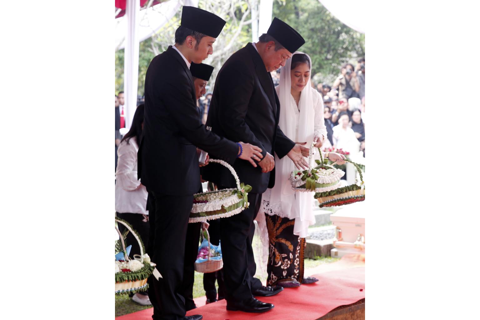 The funeral, held at Kalibata Heroes Cemetery in South Jakarta, was led by President Joko Widodo and attended by other high-profile figures, including former presidents BJ Habibie and Megawati Soekarnoputri and former vice-presidents Try Sutrisno and Boediono.