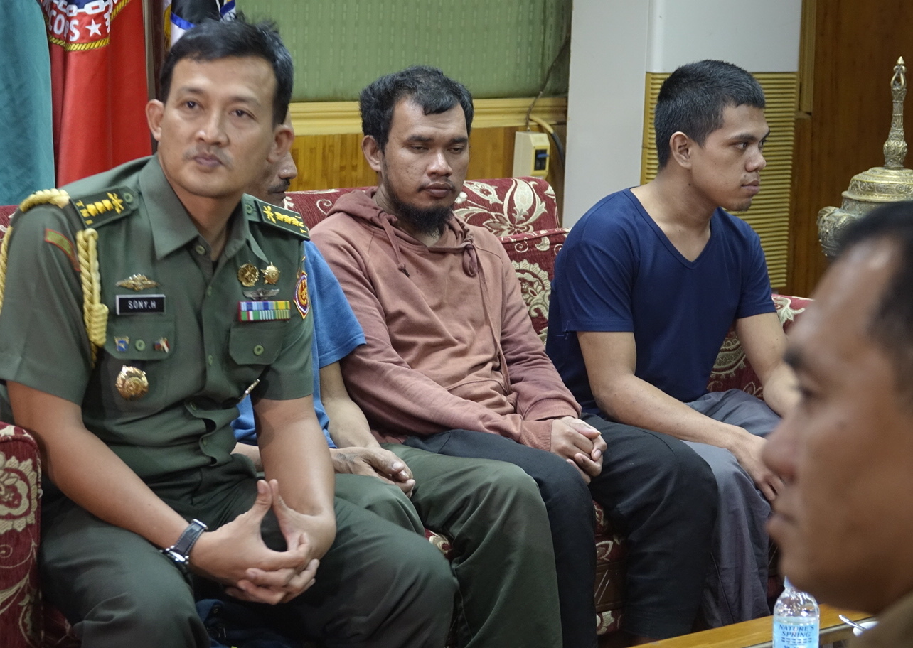 An Indonesian military officer (left) sits with two of three recovered Indonesian nationals at a military camp in Zamboanga City, southern Philippines, on Sept 16, 2018.
