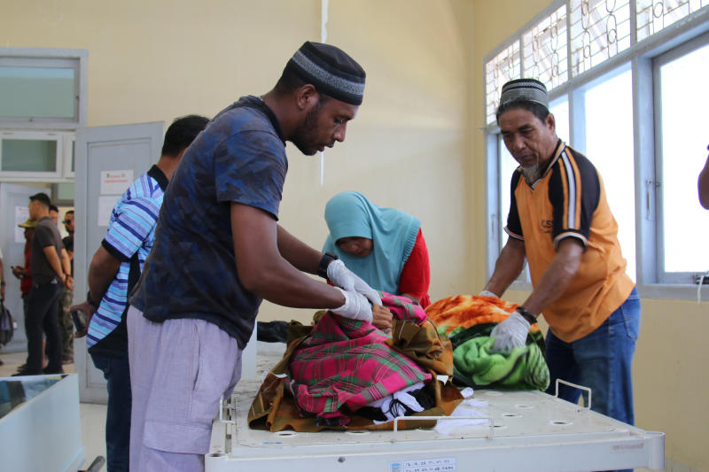 Local hospital officials and family members inspect bodies of motorcycle drivers in Intan Jaya district, Papua on Oct 26, 2019, who was killed after being shot dead by armed rebels prior to Indonesia's president visit to the restive province.