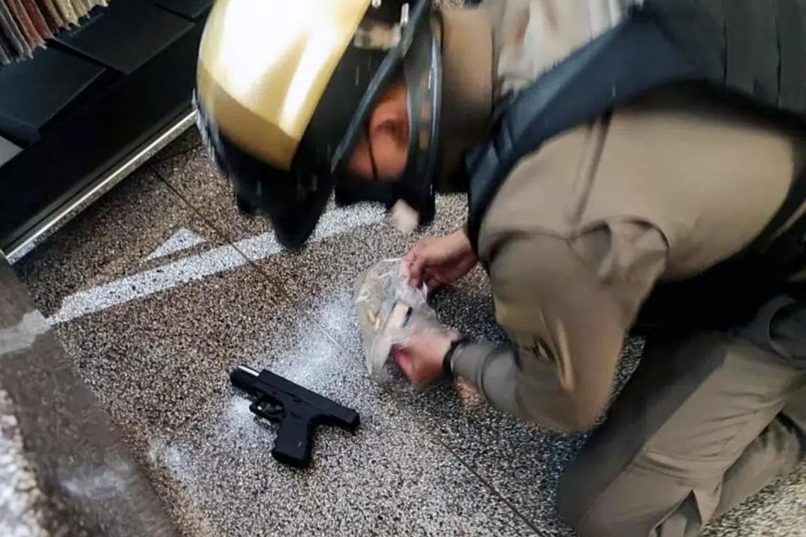 A police officer collecting a pistol as evidence after arresting a 14-year-old boy who allegedly shot and killed people at the Siam Paragon shopping mall, on Oct 3.