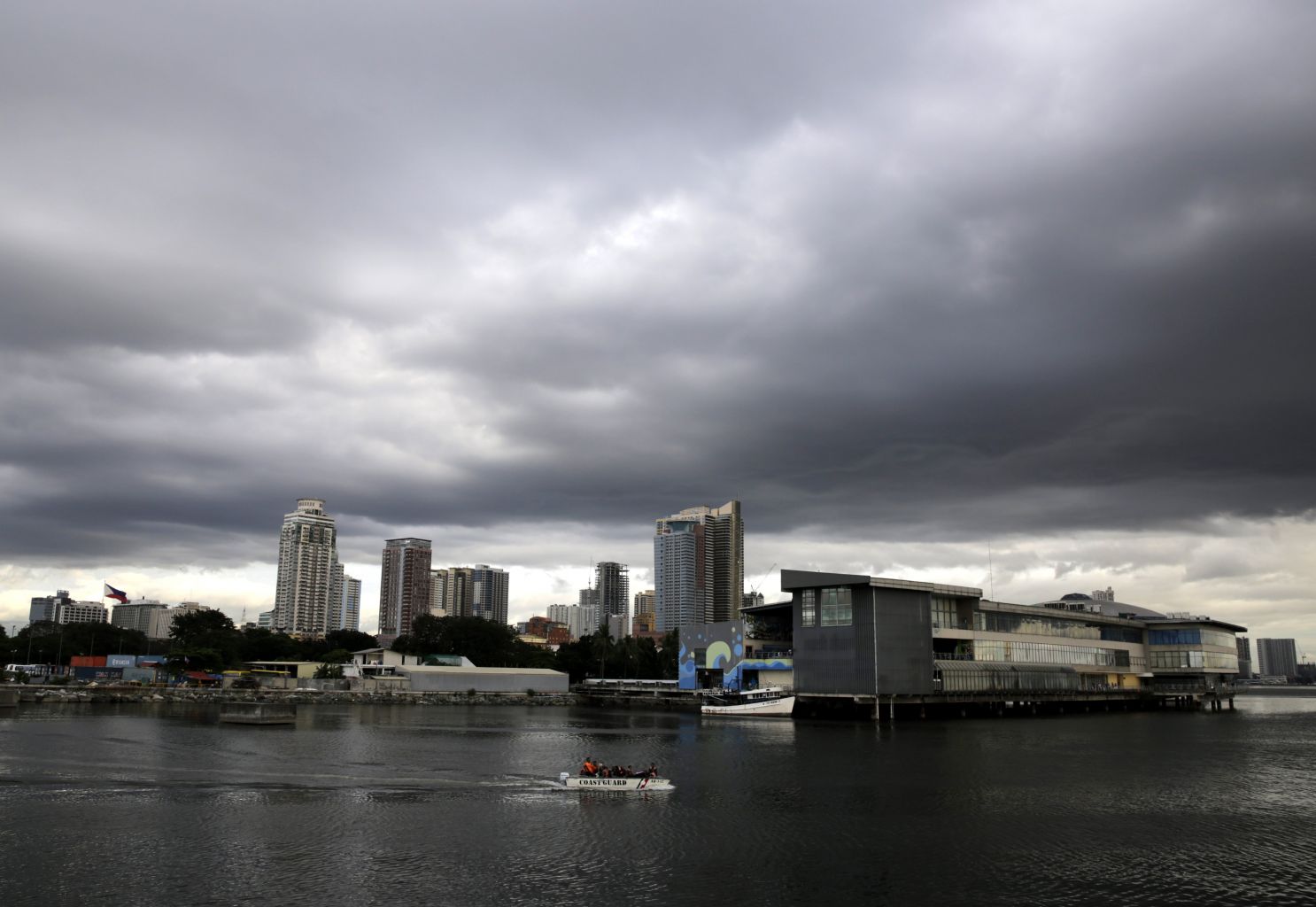 Philippine Coastguard personnel patrol on a boat as thick cloud looms over Manila on Dec 14, 2017.
