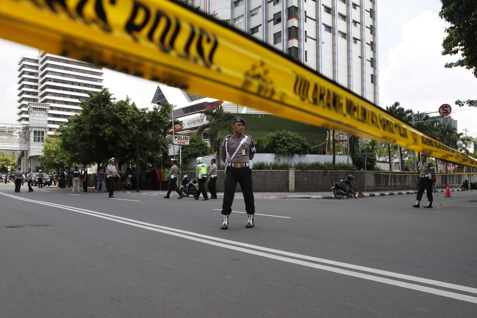 A general view shows a police cordon sealing off the scene of a bomb blast in Jakarta.