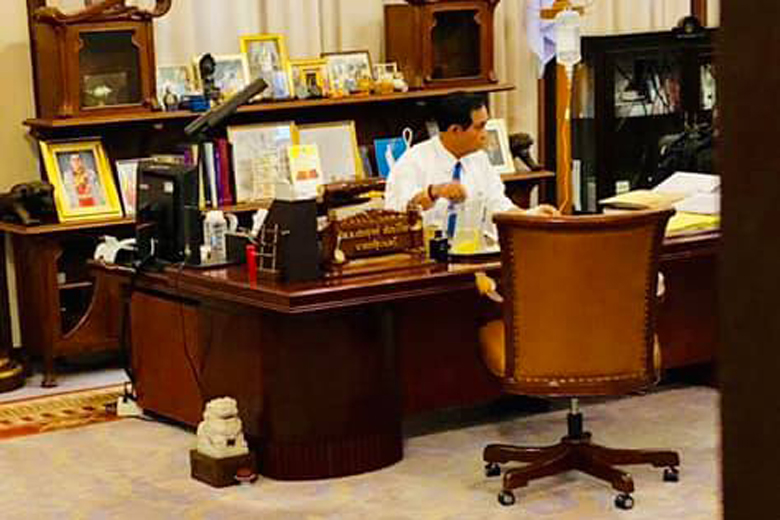 In a photo posted on the Facebook account "Gen.Prayut Chan-o-cha", the 65-year-old army general is seated at his desk, dressed in a white shirt with long sleeves rolled up to his elbows. On his left, there is a medical intravenous pole with a saline bottle hung on it. The tube from the bottle appears to be feeding into his left hand.