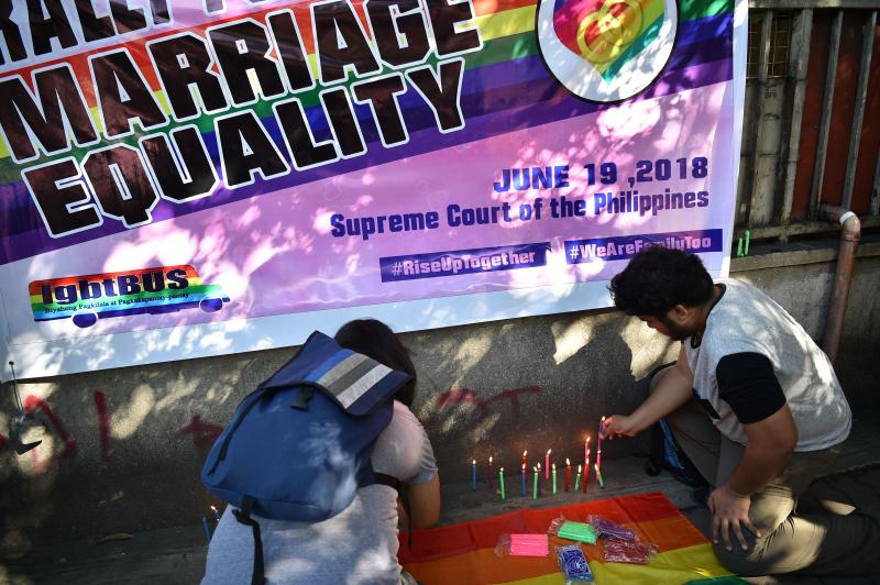 "Obviously, it would be even more landmark, more historic if they say marriage is not between a man and a woman." Outside the court on Tuesday, about 20 members of Manila's LGBT community waved rainbow flags and lit multi-coloured candles in support of the petition.