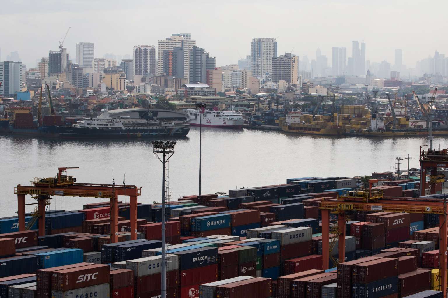 Containers sit stacked next to gantry cranes at Manila International Container Terminal (MICT) at the Port of Manila in the Philippines.