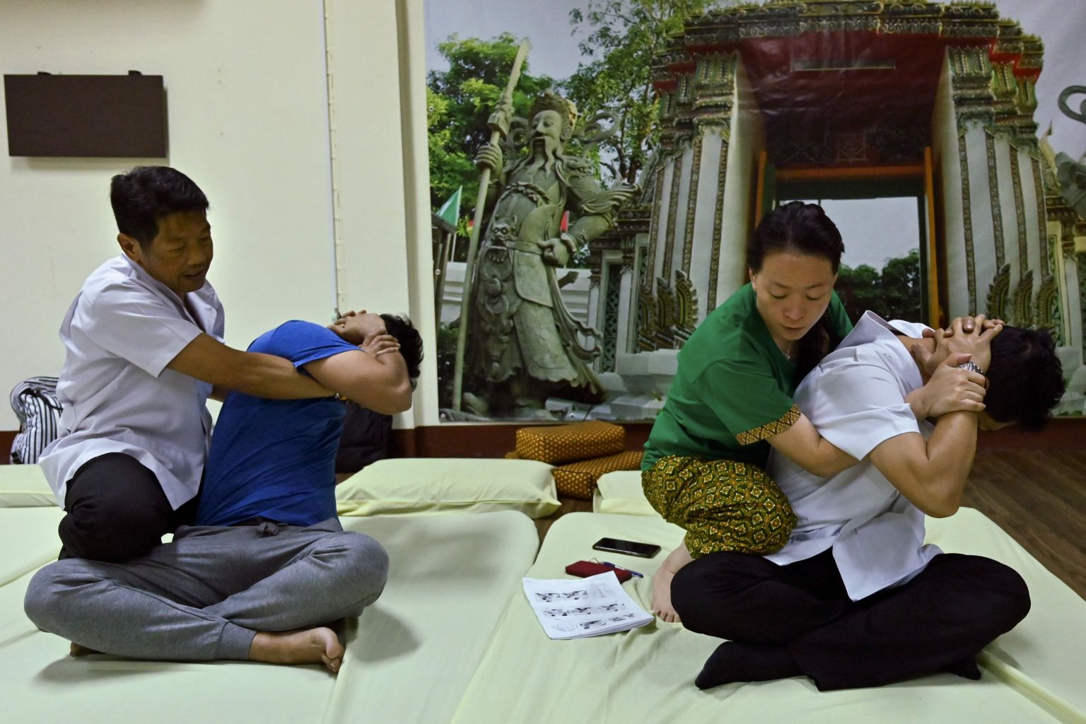 A Thai instructor (left) trains his student from Hong Kong (right) at the Wat Po Thai traditional massage school in Bangkok.